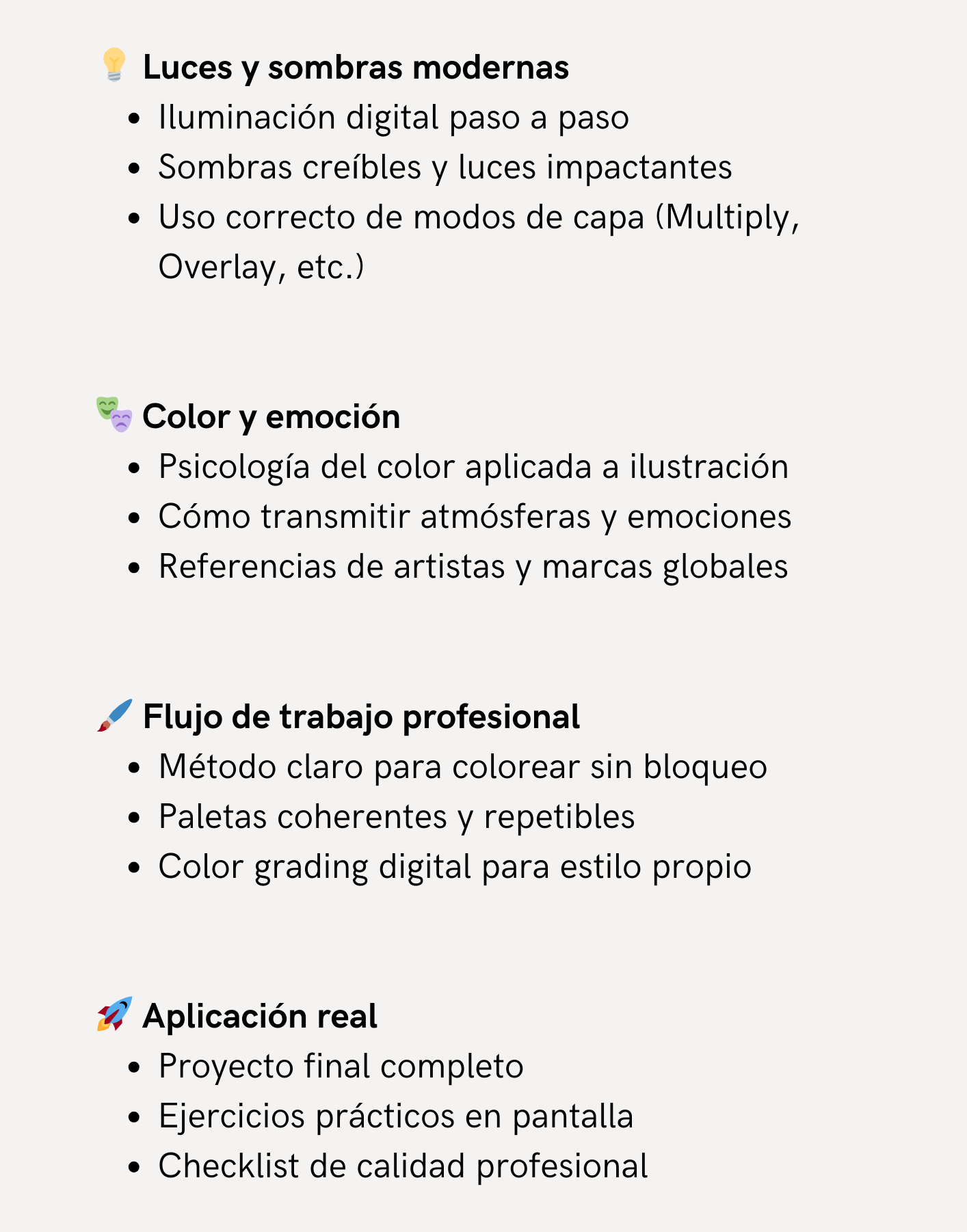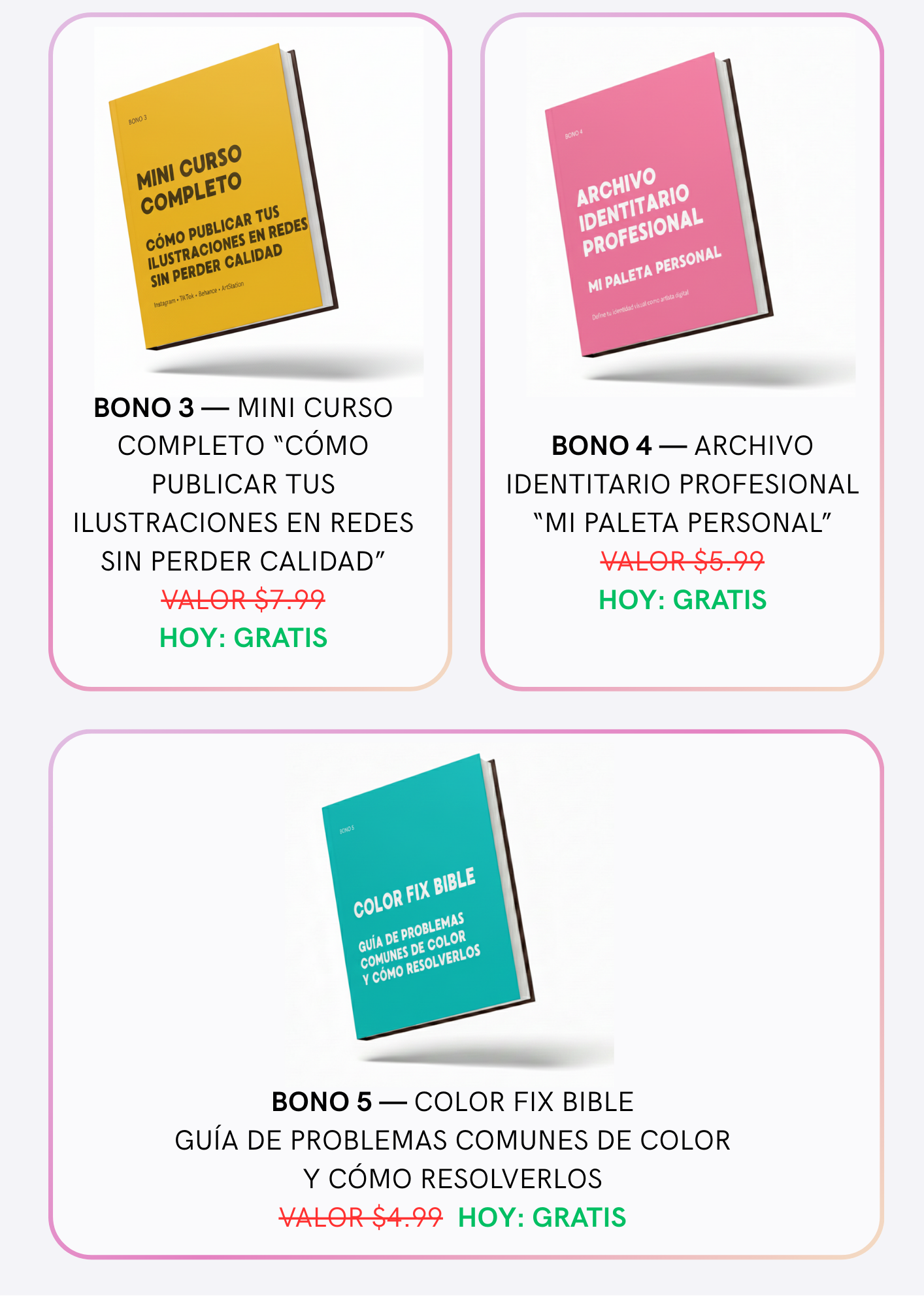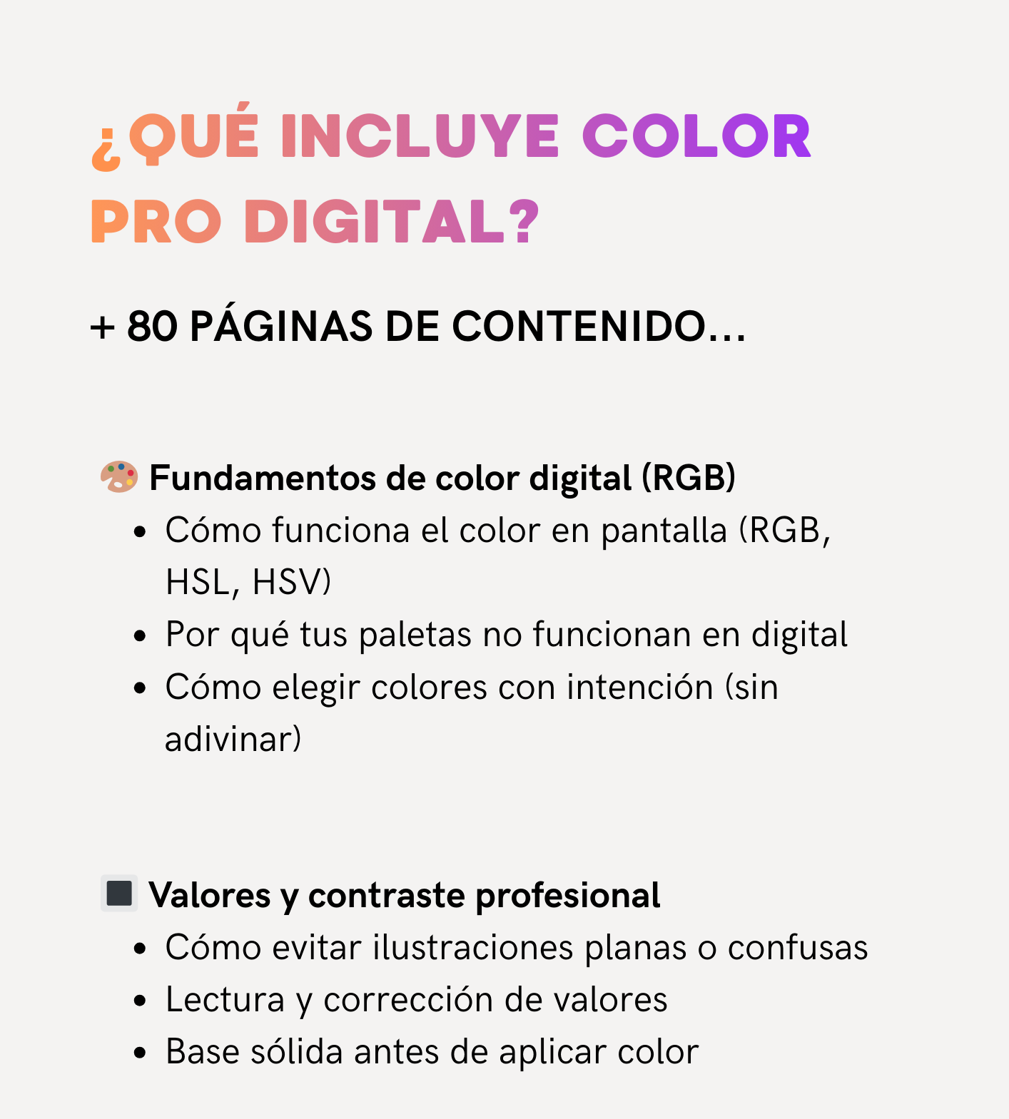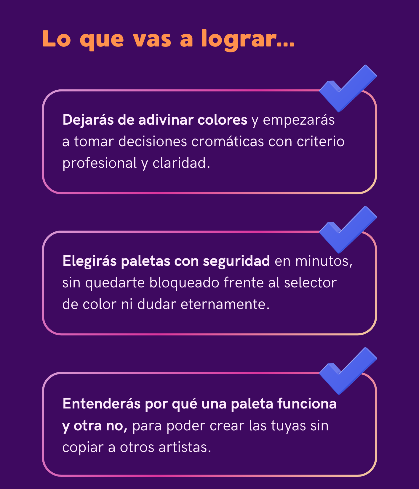 “Ya sabía teoría del color, pero me costaba aplicarla. Este ebook me dio un paso a paso claro para decidir paletas a conciencia. Entender que las luces y sombras llevan color lo cambio todo!”